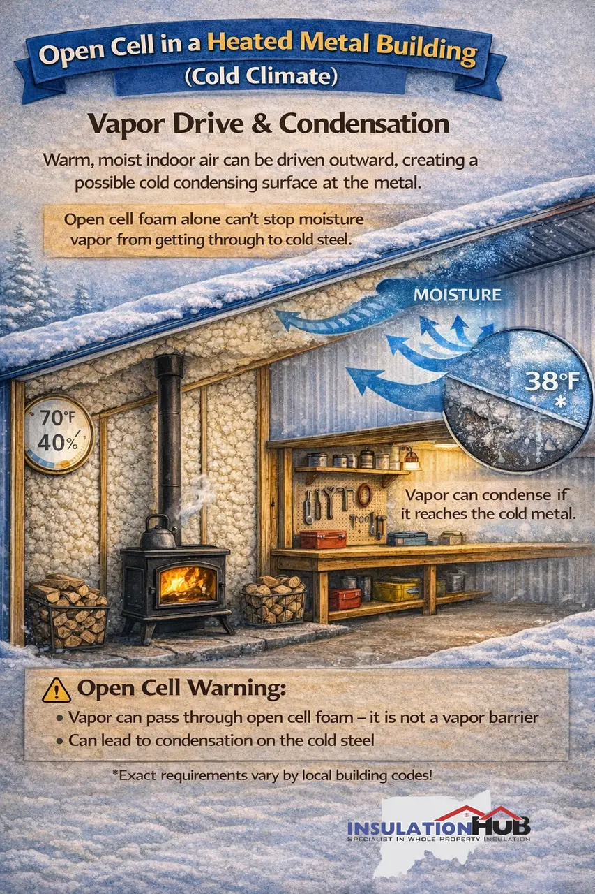 Open cell spray foam is an excellent air sealer, but it is not a vapor barrier. Moisture vapor can pass through it. This means vapor can still reach cold metal surfaces under the right conditions.