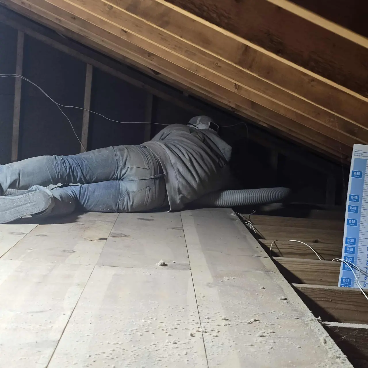 In areas like the attic, insulation depth is measured to estimate performance.